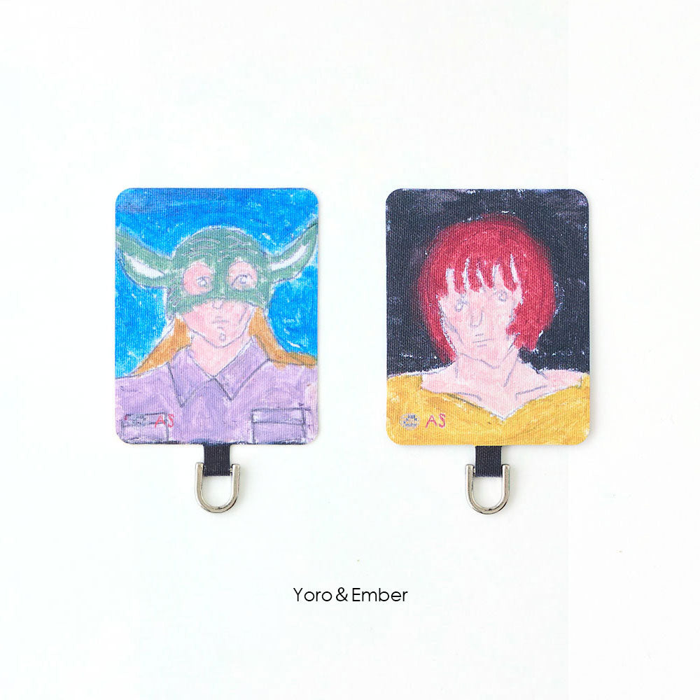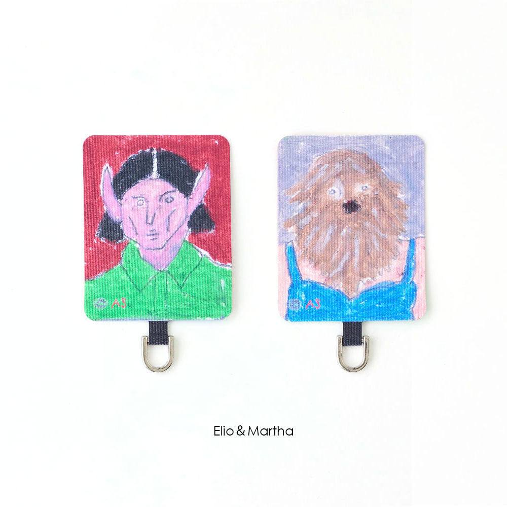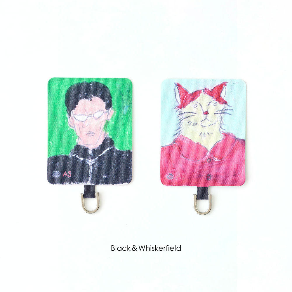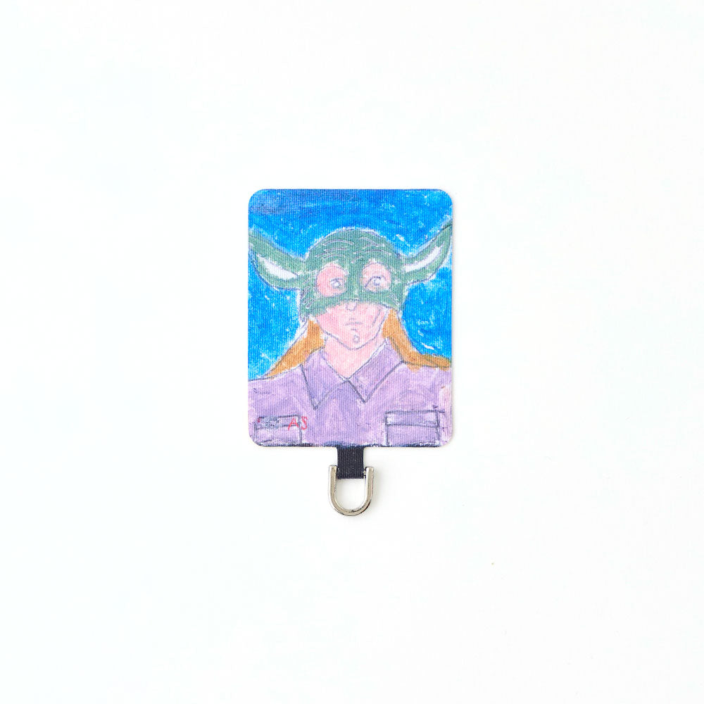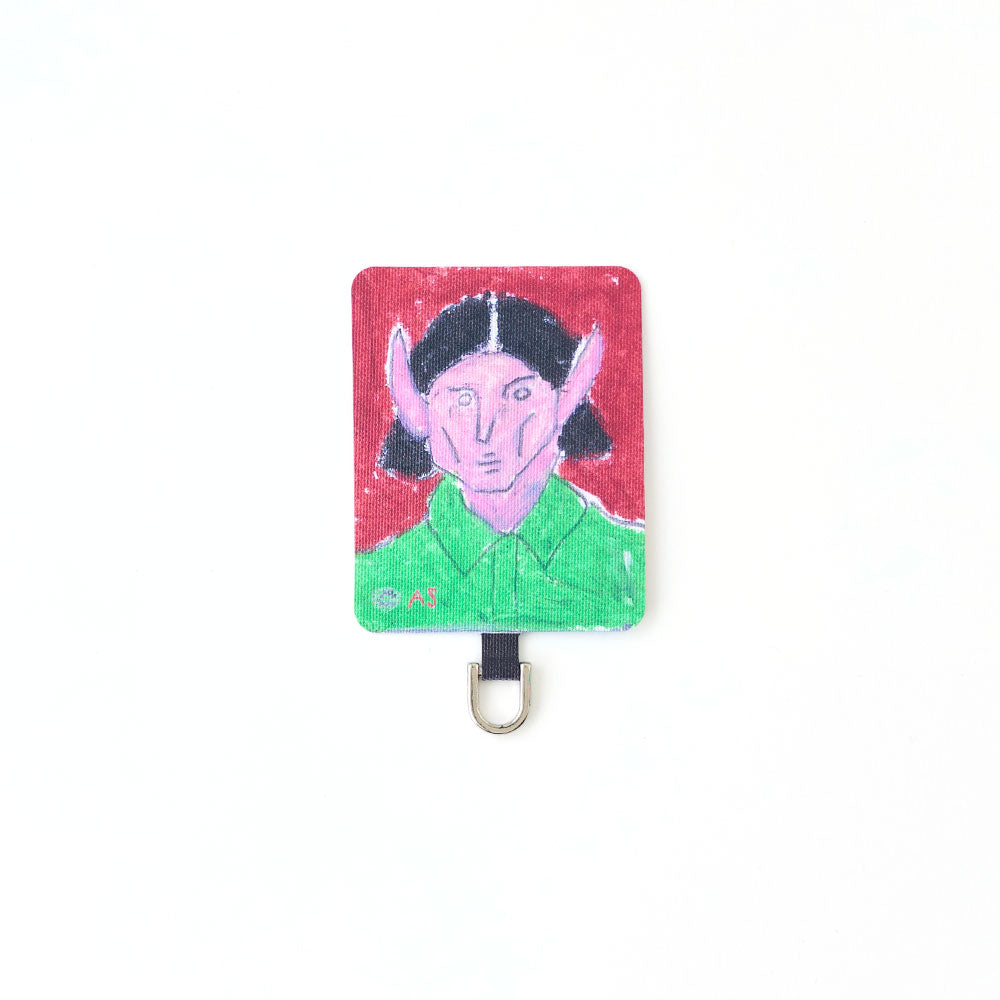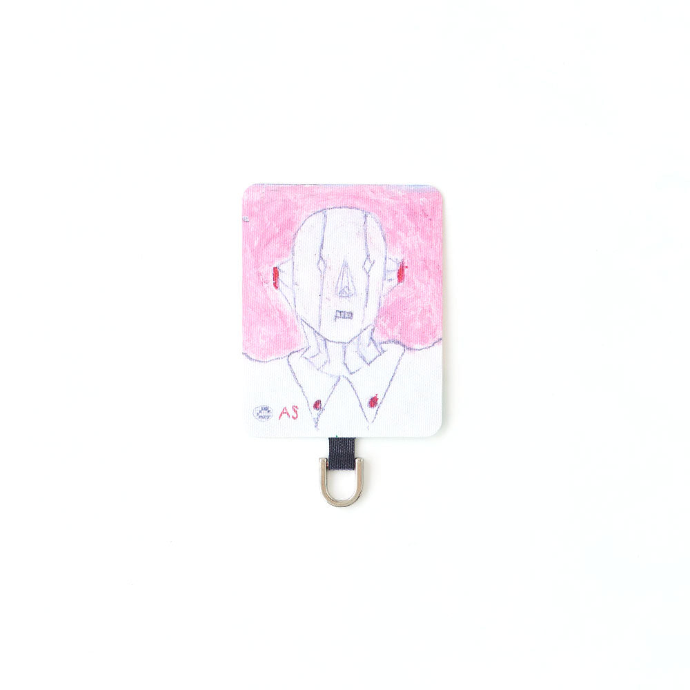 スマホケースに挟むだけで簡単に装着でき、ケース越しにユーモラスなアートが覗く遊び心あるデザイン。