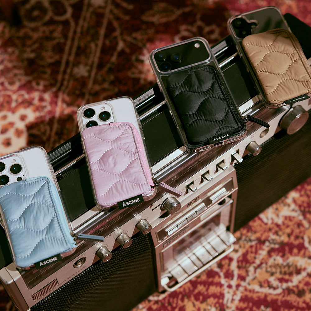 キルティング素材でポケット全面を仕上げクリアケースとの異素材感を楽しめます。